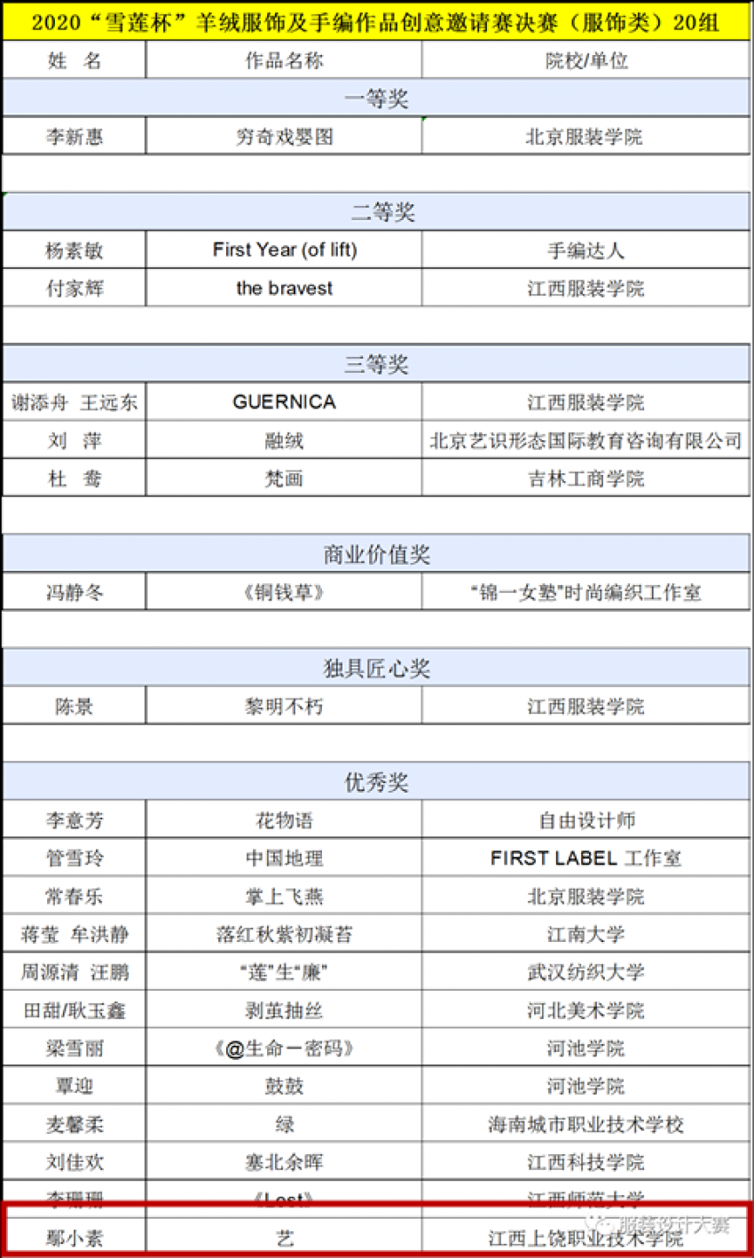 9月11日,2020年第四届“雪莲杯”羊绒服饰及手编作品创意邀请赛决赛在北京落下帷幕。上饶职院艺术体育系服装与服饰设计专业学生鄢小素设计的服饰类作品《艺》荣..