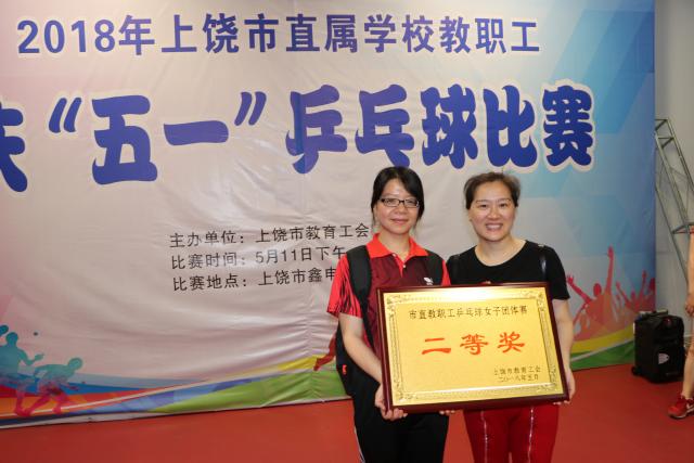 5月12日上饶市教育工会在鑫申乒乓球俱乐部举办了上饶市直属学校教职工庆“五一”乒乓球比赛,来自全市8所学校以及局机关近60名参赛选手参加了此次比赛,我院教师成绩喜人,尤文静,祝思华,胡晓霞荣获女子团体赛二等奖,另外尤文静老师在女子个人单项比赛中夺得了冠军,许捷老师在男子个人单项比赛中获得了第六名的好成绩,市教育局工会还为我院颁发了“体育道德风尚奖”。至此,此次活动圆满结束。