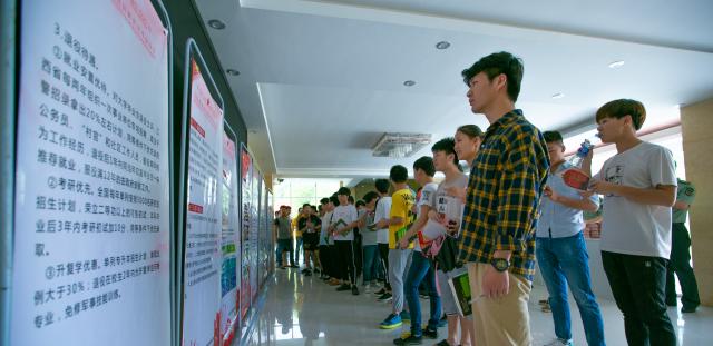 会场外征兵宣传展板林立,青年学生们簇拥在征兵咨询台前,仔细询问应征事宜,领取征兵宣传手册。