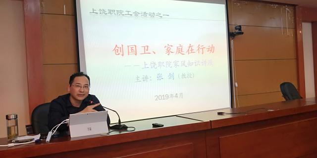 为加强家风建设,传承中华民族优秀文化传统,阐释践行社会主义核心价值观,展示党风政风、民风社风,4月23日下午,院工会在行政楼七楼会议室举办“创国卫、家庭在行动”主题知识讲座,本次讲座由教务处张剑教授主讲,来自各系部教师共80余人聆听了讲座。