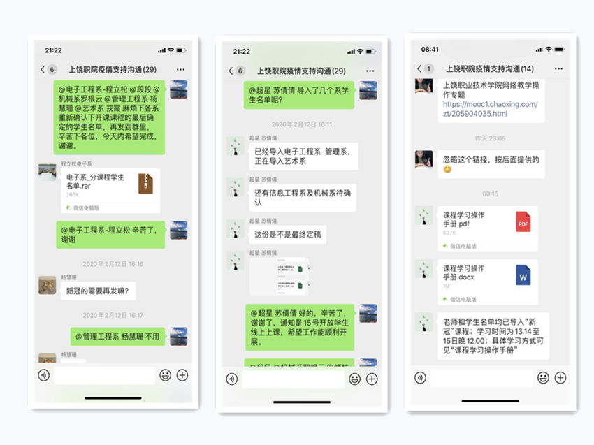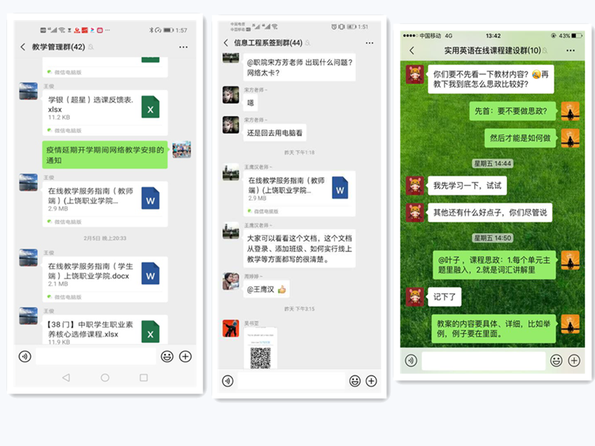 有时,线上教学受超星网上教学平台系统的容量限制,部分专业教师灵活机动,临时改用微信平台、腾讯直播平台、学习强国平台来确保完成课堂教学,或者把上课时间调整到中午与晚上进行,回避白天平台的拥挤现象,均达到了良好的教学效果。