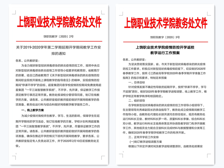 线上教学对于学生和老师都是一次全新的体验,但同时也是一次学习提升的机会。在全面做好疫情防控工作的基础上,教务处及各系、公共教研室的领导、骨干教师在线研究遴选线上教学课程,各授课老师争分夺秒、认真备课,熟悉超星网络教学平台软件,精心准备授课内容,老师们互帮互助传授经验,以直播、录播、自学等多种方式开展学习指导、作业批阅和答疑解惑等;教务处收集任课教师采用平台教学的意见反馈,为按时开课做好一切准备;学生积极配合班主任、辅导员及任课教师的安排,认真地完成线上学习任务。