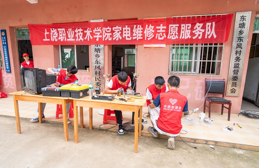 2020年是脱贫攻坚决战决胜之年,大学生们来到余干县东塘乡东风村后,分成了3个小分队开展活动。乡亲们听说大学生们要来义务维修家电,早早的就把家里的电视机、电风扇、电饭煲等家电送到了维修点,别提有多开心。