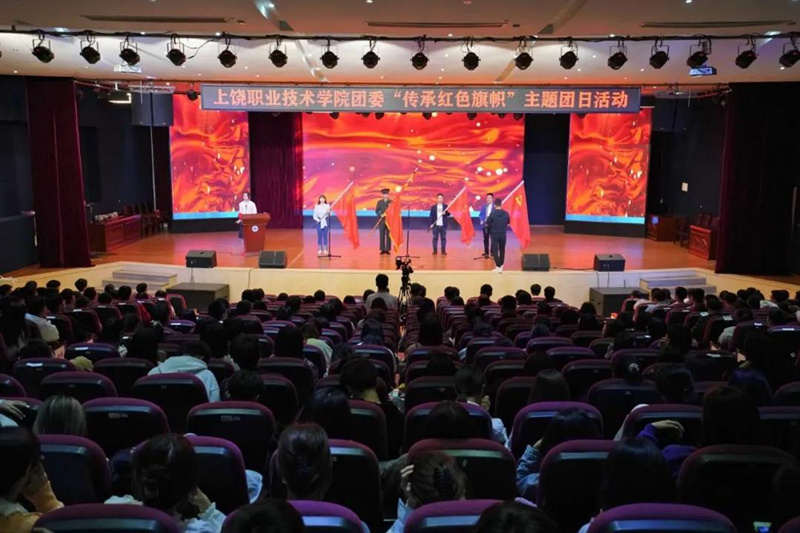 在传承红色旗帜环节,由学院先进基层党支部书记、先进教育工作者、团总支书记和在校退役士兵代表分别进行了党旗、国旗、军旗和团旗的传递仪式。