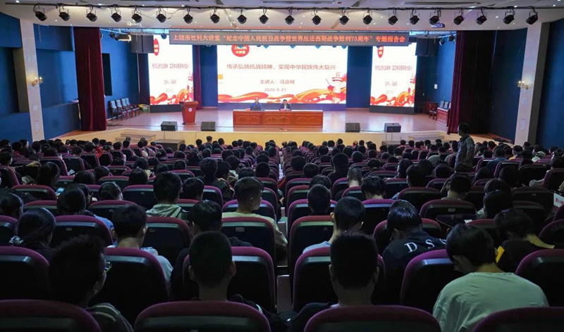 2020年是中国人民抗日战争胜利75周年,也是世界反法西斯战争胜利75周年。为贯彻落实中央、省、市委关于组织开展纪念活动的精神,教育引导广大千部群众大力弘扬伟大的抗战精神,进一步激发爱国热情,更好地凝聚改革力量、增强发展信心,市委宣传部以社科大讲堂进校园的形式,举办上饶市社科大讲堂“纪念中国人民抗日战争暨世界反法西斯战争胜利75周年”专题报告会。