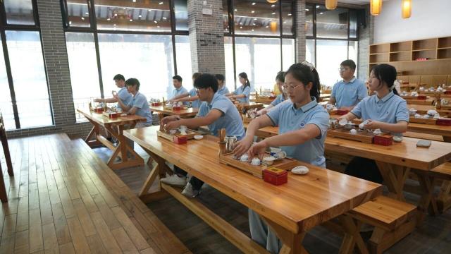 在茶文化展示馆,制茶师将师生采摘的鲜叶现场制茶,通过摊晾、杀青、揉捻、干燥等工序,最终形成独特的茶叶。制茶师精湛的手法让围观的师生们不时发出阵阵惊叹,被制茶工艺的精妙所折服。