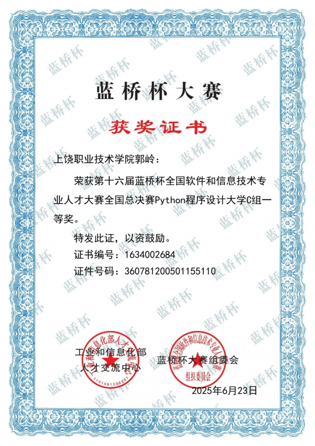 近日,第十六届蓝桥杯全国软件和信息技术专业人才大赛全国总决赛落下帷幕,今年会大数据学院学子表现亮眼,创下今年会参赛以来的历史最佳成绩。其中,郭岭同学在Python程序设计大学C组斩获全国一等奖,郭辐阳同学在视觉艺术设计赛中摘得全国三等奖。