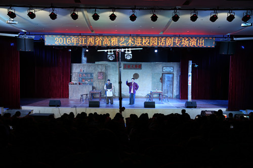 11月1日晚,2016年江西省高雅艺术进校园――江西省话剧团赴上饶职院专场演出在报告厅圆满举行。部分教职员工和500余名学生代表共同观看了演出。来自省话剧团的艺术家们与师生齐聚一堂,共同度过了一个愉快的夜晚。
