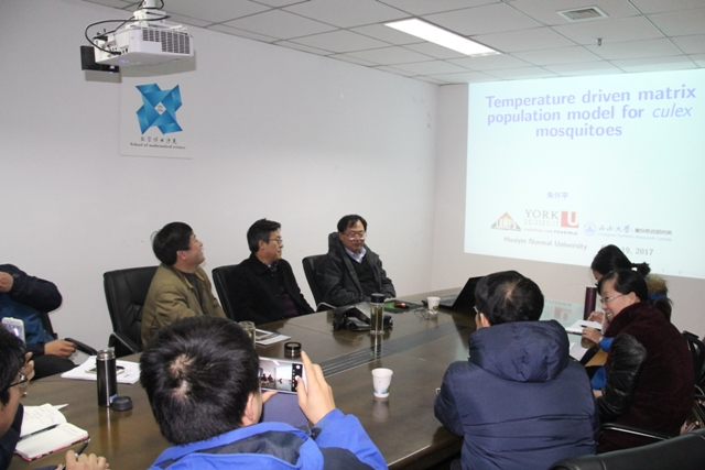 2017年12月18日至20日,应数学科学学院邀请,国际著名应用数学家、我校杰出校友、加拿大约克大学朱怀平教授来校访问交流,并于19日下午17:00时作题为《A temperature driven matrix model for Culex mosquitoes population》的学术报告。报告会由数学科学学院院长柏传志教授主持,数学重点学科组成员、青年博士聆听了报告会。