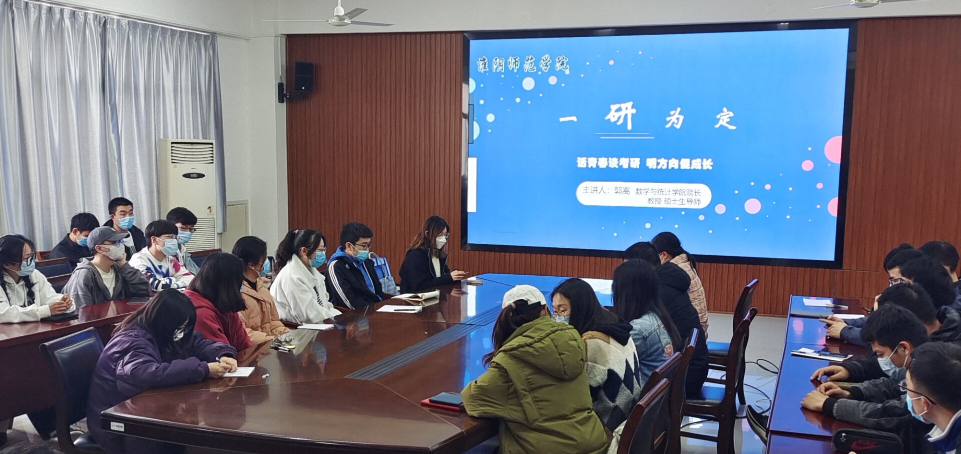 翔宇网3月27日电 (记者 邵帅 黄雨晴)为进一步助力考研学生做好充分的复试准备,调动学生考研积极性,明确考研目标、提升备考技巧,数统学院于3月26日下午在理北315召开了“话青春谈考研,明方向促成长”的考研座谈会,线上会议同步进行。院长郭嵩出席并主持讲话,2019级所有考研学生通过线上线下参与讲座。