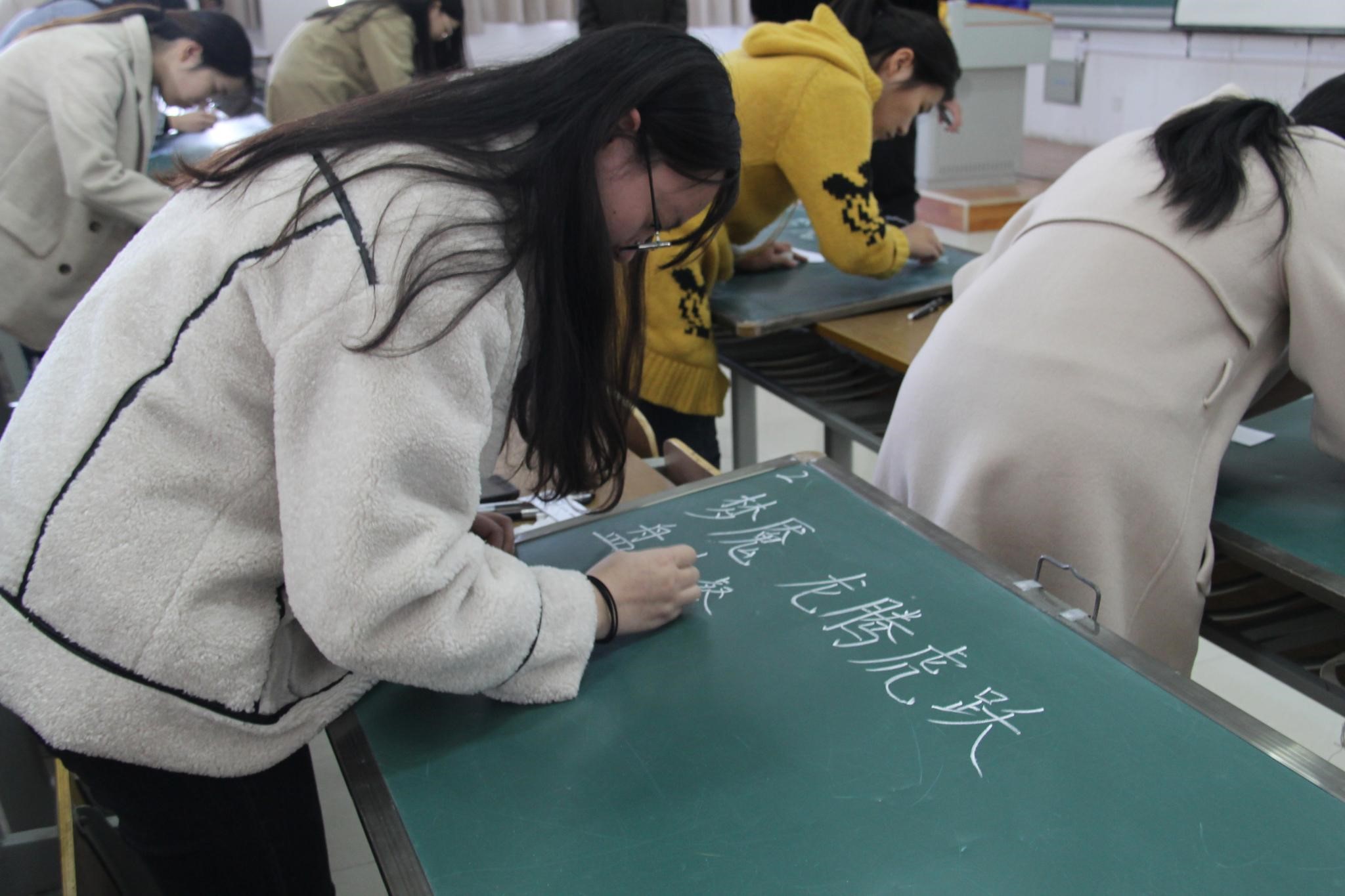 比赛开始前,马强老师为参赛选手说明比赛规则和注意事项。他不断强调着粉笔字和钢笔字的书写技巧、笔画顺序,选手们也专注听讲,用心书写每一个笔画,每一个汉字,尽其所能展现自身书法才艺。不一会儿,一个个委婉流畅,刚健遒劲的粉笔字跃然眼前。十分钟后,所有选手离场,由马强老师现场评分。