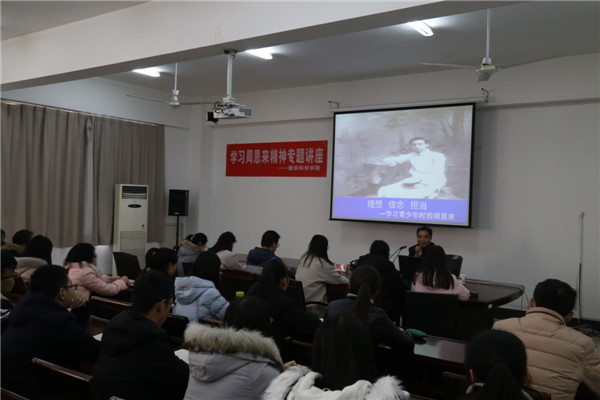 讲座在同学们的阵阵掌声中结束。数科学院的此次学习青年周恩来的讲座给同学们提供了一个与伟人总理对话心灵、升华思想的空间。同学们听完讲座后纷纷表示,不管是在青年时期还是投身革命后的恩来,其精神、思想、人生观、价值观都是青年大学生应当认真学习并大力弘扬的,更是实现伟大中国梦的强大力量支撑。