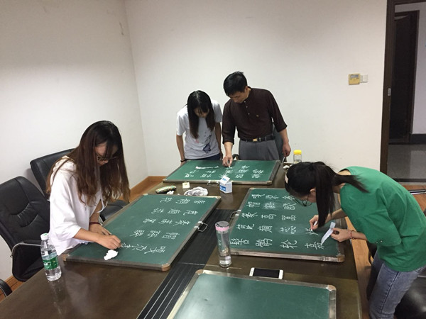 之后,马强老师让几名学生生代表在小黑板上书写粉笔字。面对同学提出的疑问和书写过程中表现出的些许不足之处,马强老师耐心解答,并进行指点和亲身示范。期间,同学们围在老师身边,认真学习了书写粉笔字的方法和技巧。