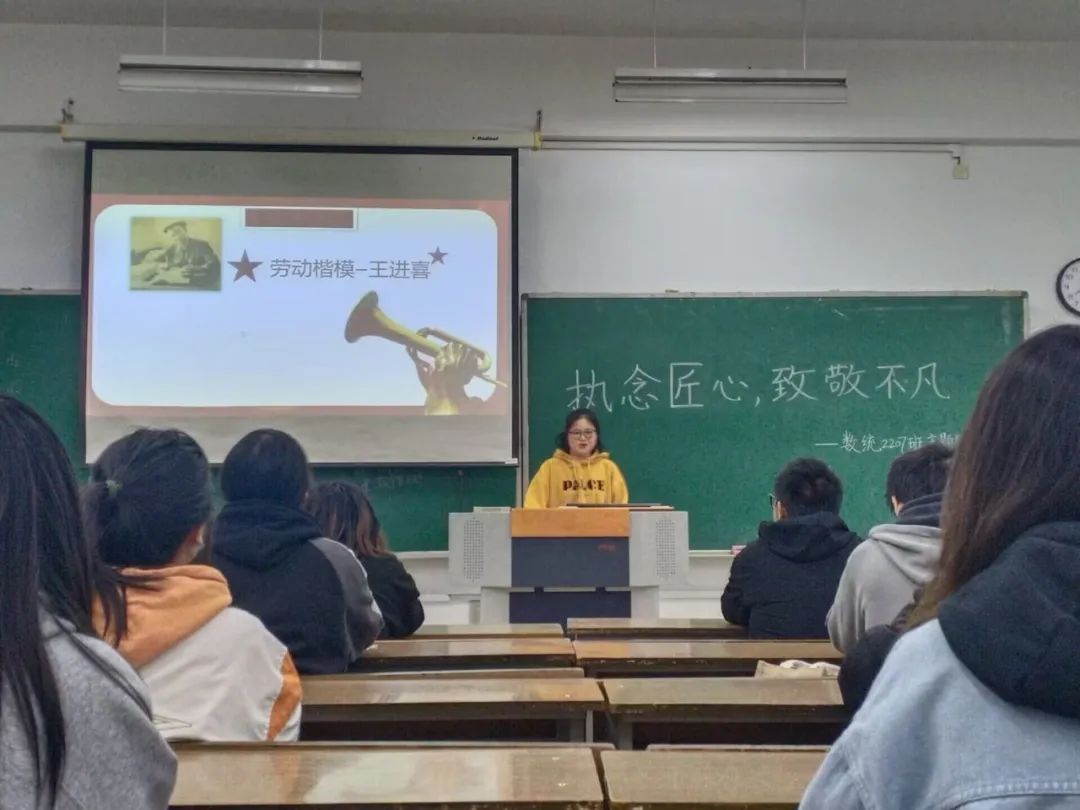 活动伊始,团支书给同学们播放了一个介绍劳动节的视频,并讲述了劳动节的由来。接着,团支书列举了一些劳动模范的例子,以PPT的形式生动地讲述了他们的匠心精神。