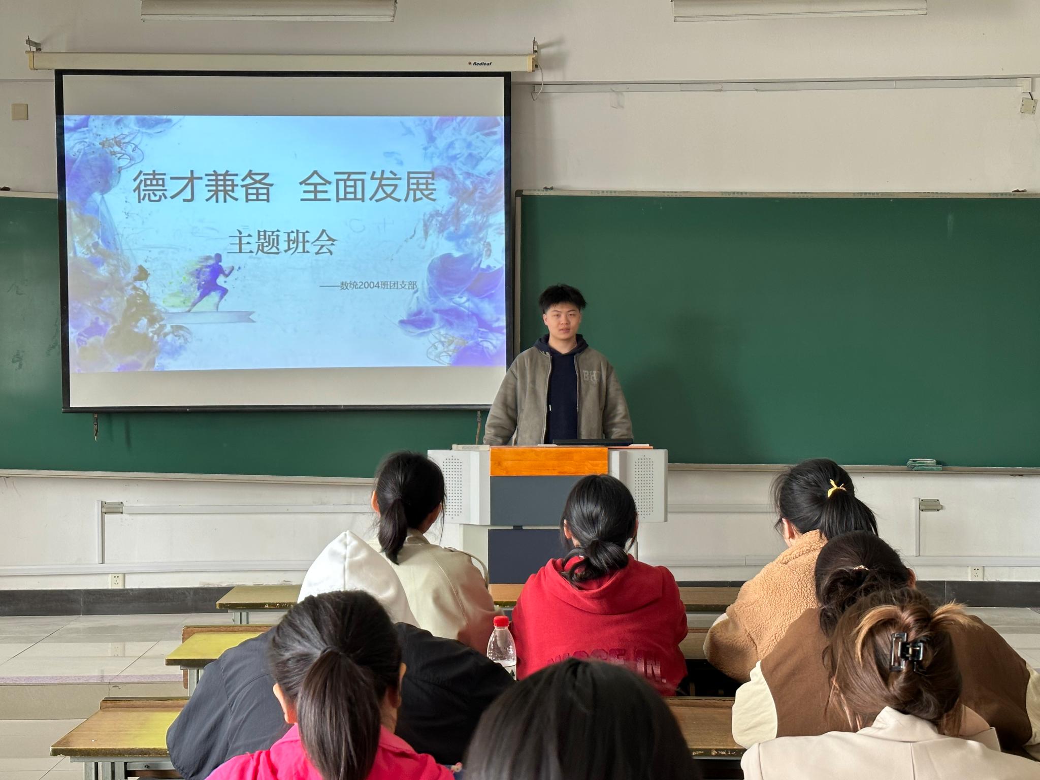 翔宇网4月19日电(记者 李雨桐)为深入学习贯彻党的二十大精神,让德才兼备、全面发展成为同学们的自觉追求,全面提升学生综合素质,努力培养“德智体美劳”全面发展的合格的社会主义建设者和接班人,数统学院2004班分别于4月16、17、18日下午在理南215举办“德才兼备,全面发展”主题教育月动员大会、“德才并进 知行合一”主题师生座谈会、“德才兼备,全面发展”主题班会,三次活由徐钰同学主持。