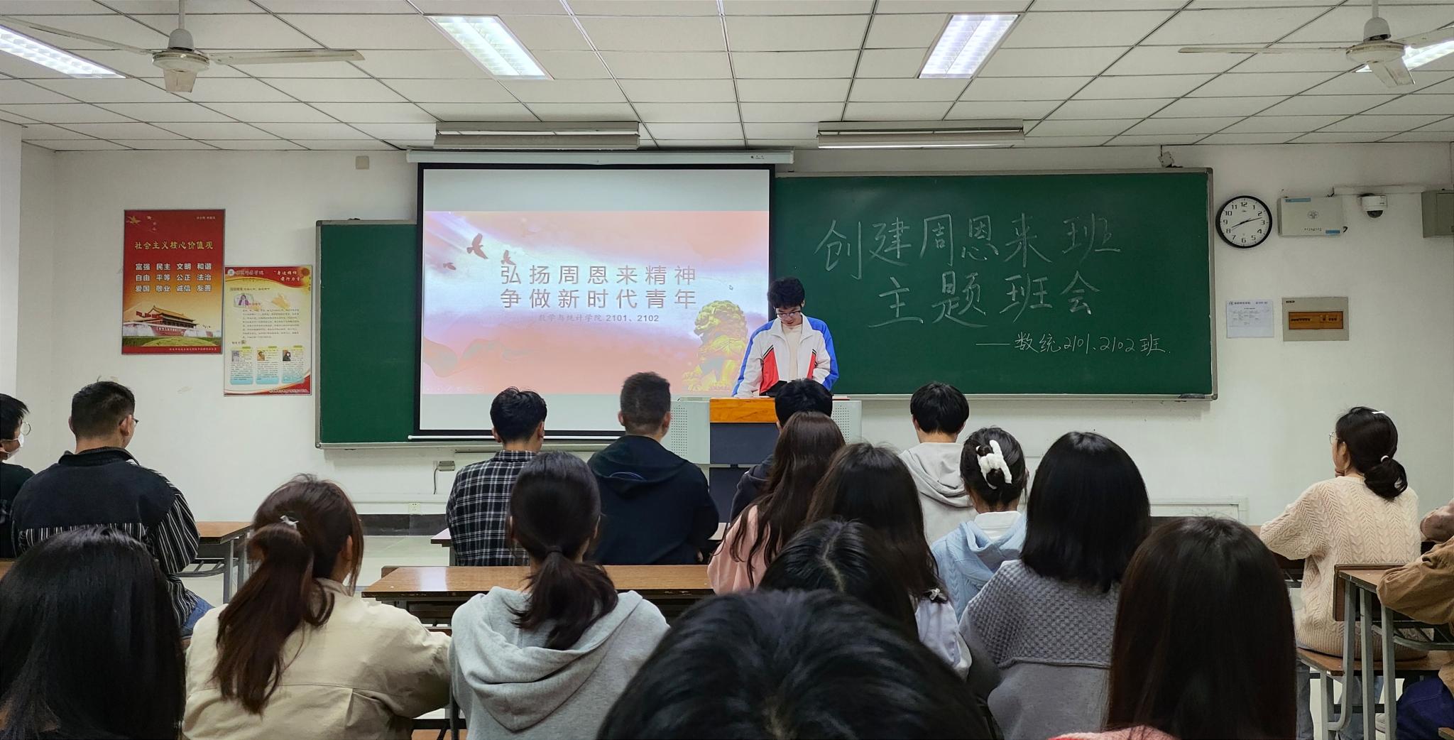 翔宇网4月2日电(记者 李盼盼)为进一步贯彻落实习近平新时代中国特色社会主义思想,更好地学习、宣传和弘扬周恩来同志的崇高精神、高尚品德和伟大风范,把“坚守朴实,追求崇高”的淮师精神融入到广大团员青年的学习和生活中去,挖掘、选树践行社会主义核心价值观的优秀学生集体典型,数统2101、2102班于2023年3月9日晚上20点于理南210教室集体开展“弘扬周恩来精神,争做新时代青年”的主题活动。
