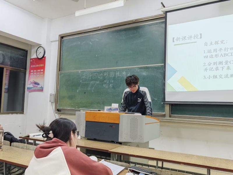 活动伊始,戴斌同学组织课堂模拟。讲授“平行四边形的性质2”,他先回顾之前知识,巩固同学们的基础,接着用老人分地的实例引入新课,快速抓住大家的注意力。课堂模拟中,面对“学生”交头接耳,戴斌同学巧妙提问,顺利化解课堂危机,展现出良好的课堂掌控能力。