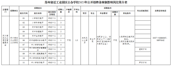 招聘岗位、计划招聘人数及相关要求等详见《苏州宿迁工业园区公办学校2023年公开招聘备案制教师岗位简介表》(见附件,以下简称《岗位简介表》)。