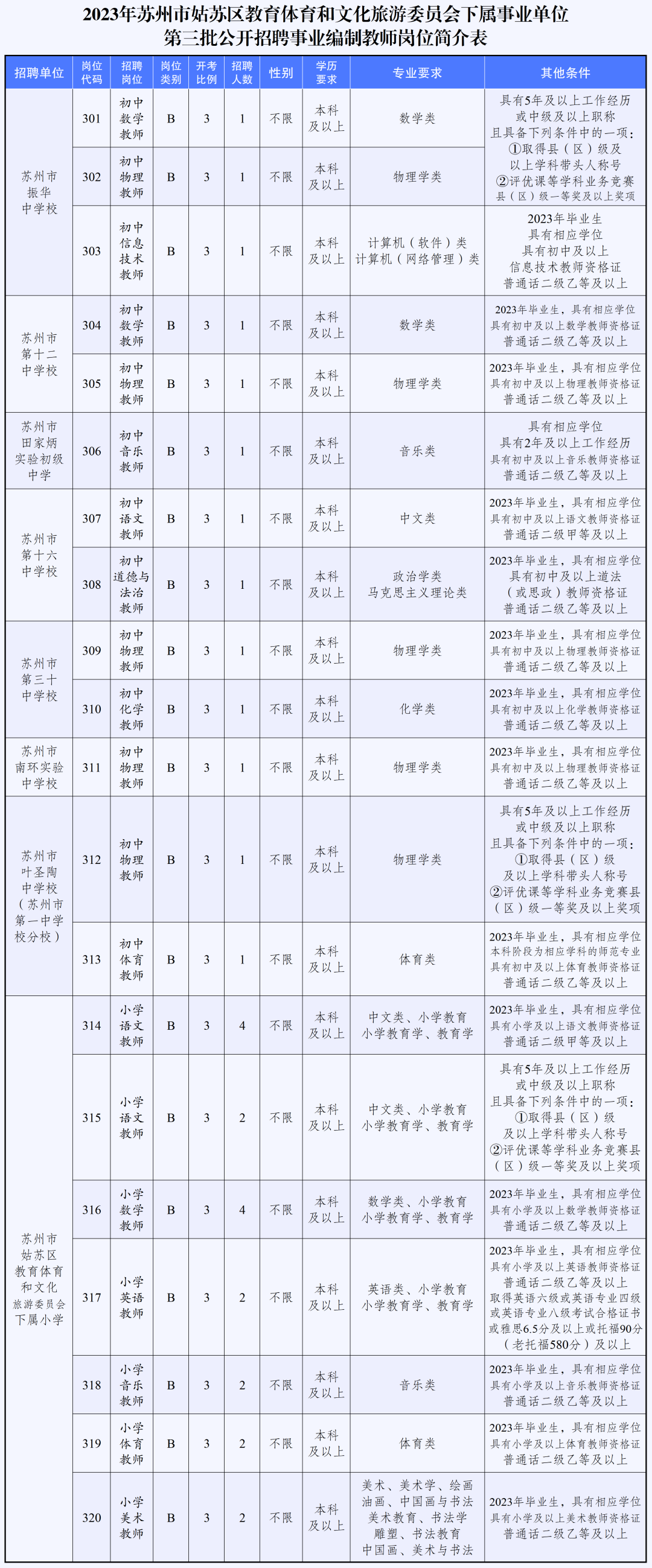 2023年苏州市姑苏区教育体育和文化旅游委员会下属事业单位第三批公开招聘事业编制教师岗位简介表