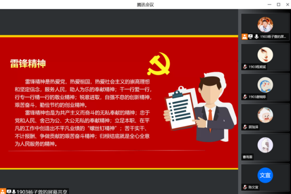 翔宇网3月5日电(记者 程昶斌)为使同学们深入学习习近平新时代中国特色社会主义思想,数统1903班于35日下午三点在线上举办“雷锋精神是时代永不落幕的话题”主题班团活动。此次活动由1903班杨子萱同学主持。