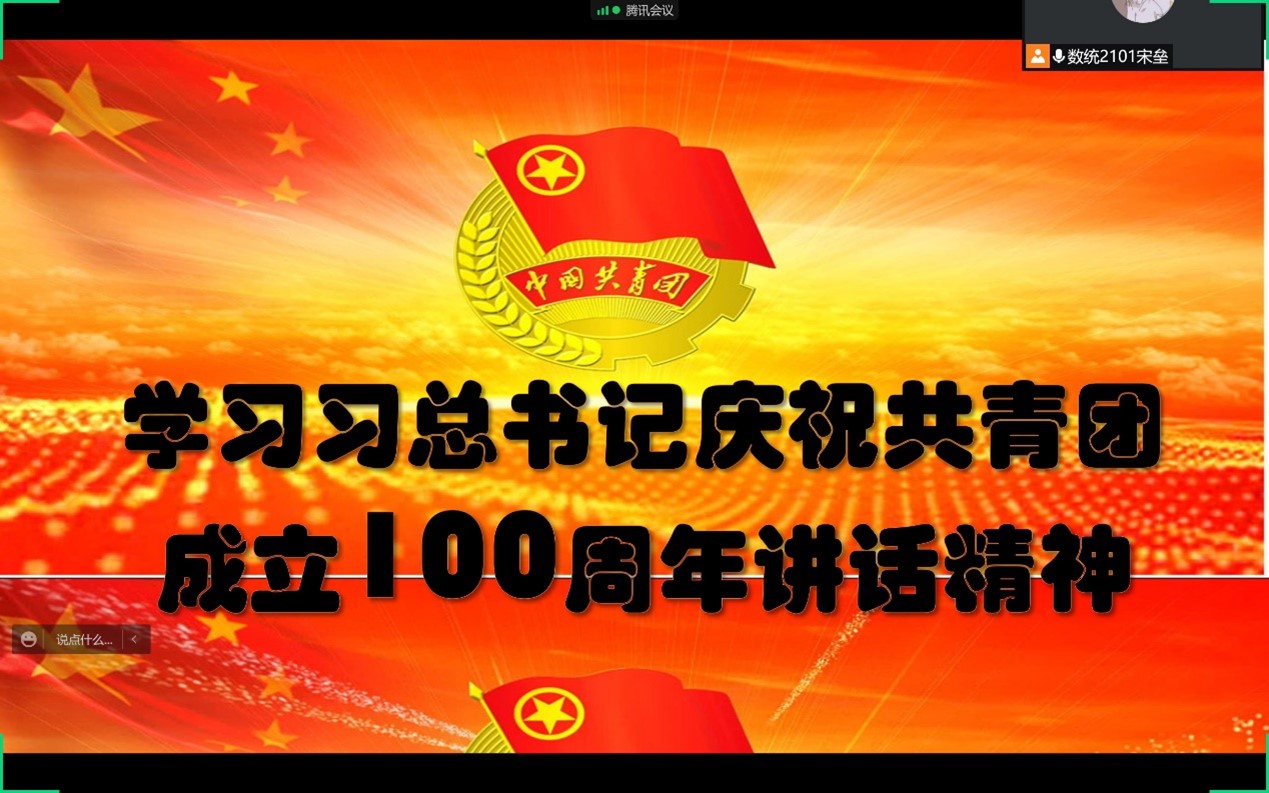 翔宇网5月12日电 (记者 宋垒)数统学院2101班在5月11号晚上于线上腾讯课堂召开了学习习近平总书记在庆祝中国共青团成立100周年大会上的重要讲话精神。本次活动由2101班团支书宋垒主持,参与大会的人员是2101班全体同学。