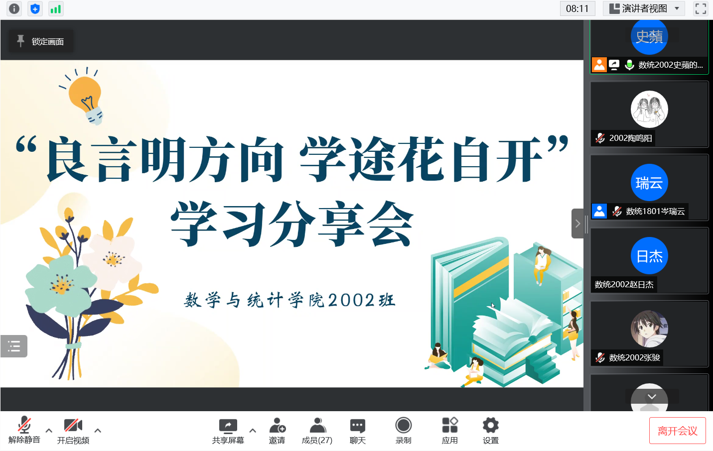 翔宇网4月13日电 (记者 刘晓 睢堰 陶鸣阳)为进一步激发同学们的学习热情,明确学习目标,掌握相关的学习技巧,4月12日,数统2002班于线上召开“良言明方向 学途花自开”学习分享会。本次分享会特别邀请18级学生王彧、岑瑞云、朱汪琪作学习经验分享。会议由数统2002班学生史蘋主持。