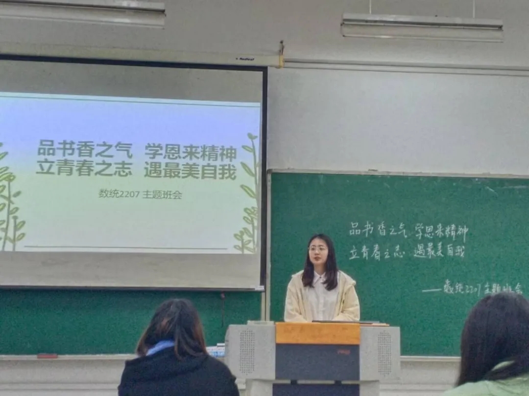 接着,班长成佳圣列举了读书的意义,并倡导同学们多走进名家名篇中,感知文字语言的力量,和跨越时空的作者对话。最后,活动进行到第四个环节“遇最美自我”。同学们在明信片上写下了自己的期望、美好愿望与目标,一撇一捺都诉说着对未来的期许与向往。大家也都明确了自己的短期目标与长期目标,向着未来不断努力奋斗!在花样年华,于读书中遇见最美的自己!