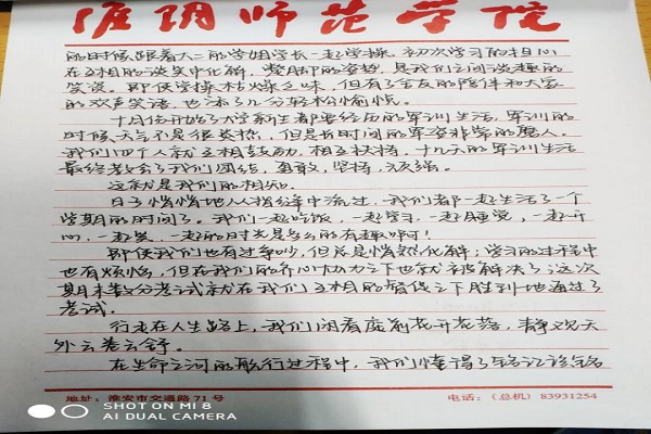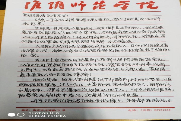 淮师新闻网3月28日电(记者 刘雪宁)在大学,室友是我们生活的伴侣,是我们的情感寄托,但在日常生活中点点滴滴的小事中难免不存在一些小矛盾。数学科学学院心理联合部组织开展“相遇及相知”写给室友的一封信的书信比赛,为同学们提供情感表达的场所,发现、思索及巩固室友情谊,让同学们通过文字的形式与自己的室友敞开心扉,倾诉心语,促进寝室成员之间内心深处的沟通,营造寝室文明、健康、温馨、和谐的氛围。