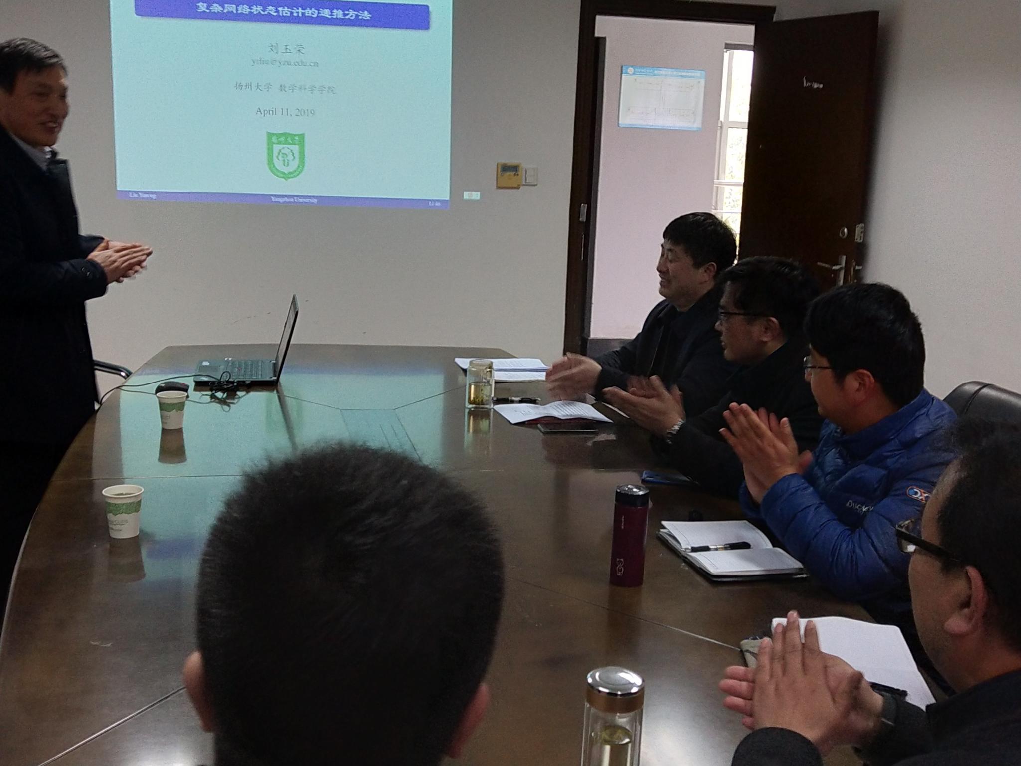 2019年4月11日上午,扬州大学数科院博士生导师刘玉荣教授应数科院邀请,在数科院报告厅理北301室做了题为《复杂网络状态估计的递推方法》的报告,报告会由柏传志院长主持。数学重点学科组成员与研究生聆听了报告会.