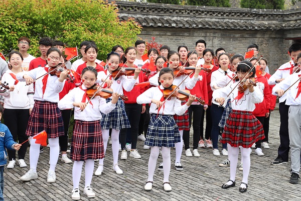 二胡、长笛、琵琶、扬琴、古筝、小提琴、大提琴,中西传统乐器合奏《我的祖国》颂曲;淮师大学生代表团挥舞手中国旗,合唱壮美赞歌;舞者踏着激昂鼓点,动作干脆,舞出大国情怀。不少市民深受感染,自行加入合唱队伍,为祖国高歌吟唱。“万青选”展厅前,少先队员系红领巾,共青团员胸戴团徽,一齐朗诵诗篇《我愿做总理胸前的小像章》。