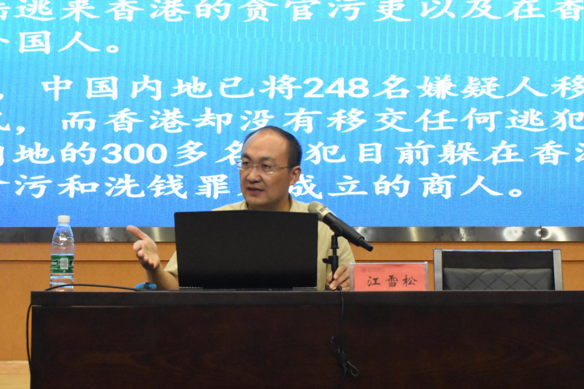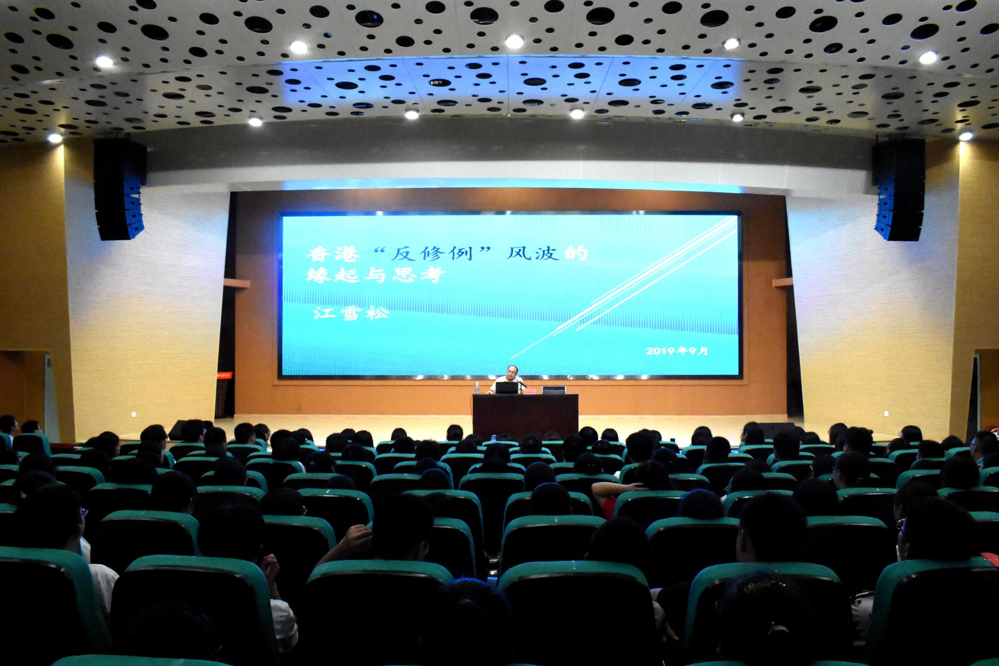 本次讲座的主讲人是法政学院江雪松教授。对于此次香港的“风波”,他指出,如果长期关注香港问题,就可以发现目前香港局势“既在意料之中,又在情理之外。”他以“风波起、风波恶、定风波” 三个方面为纲,详细介绍了香港修例的缘起、发展及可能走向。“反修例”风波为何而起?香港《逃犯条例》的修订内容真有问题吗?有谁在反对?江教授通过生活化、时事性的案例对专业知识进行解释,让青年学子们很快理解并产生共鸣。江教授强调了修例的法理正当性,应当纠正“犯罪特许”,没有任何国家可以容忍嫌疑人从国家的某个地方逃到另一个地方来逃避司法制裁。