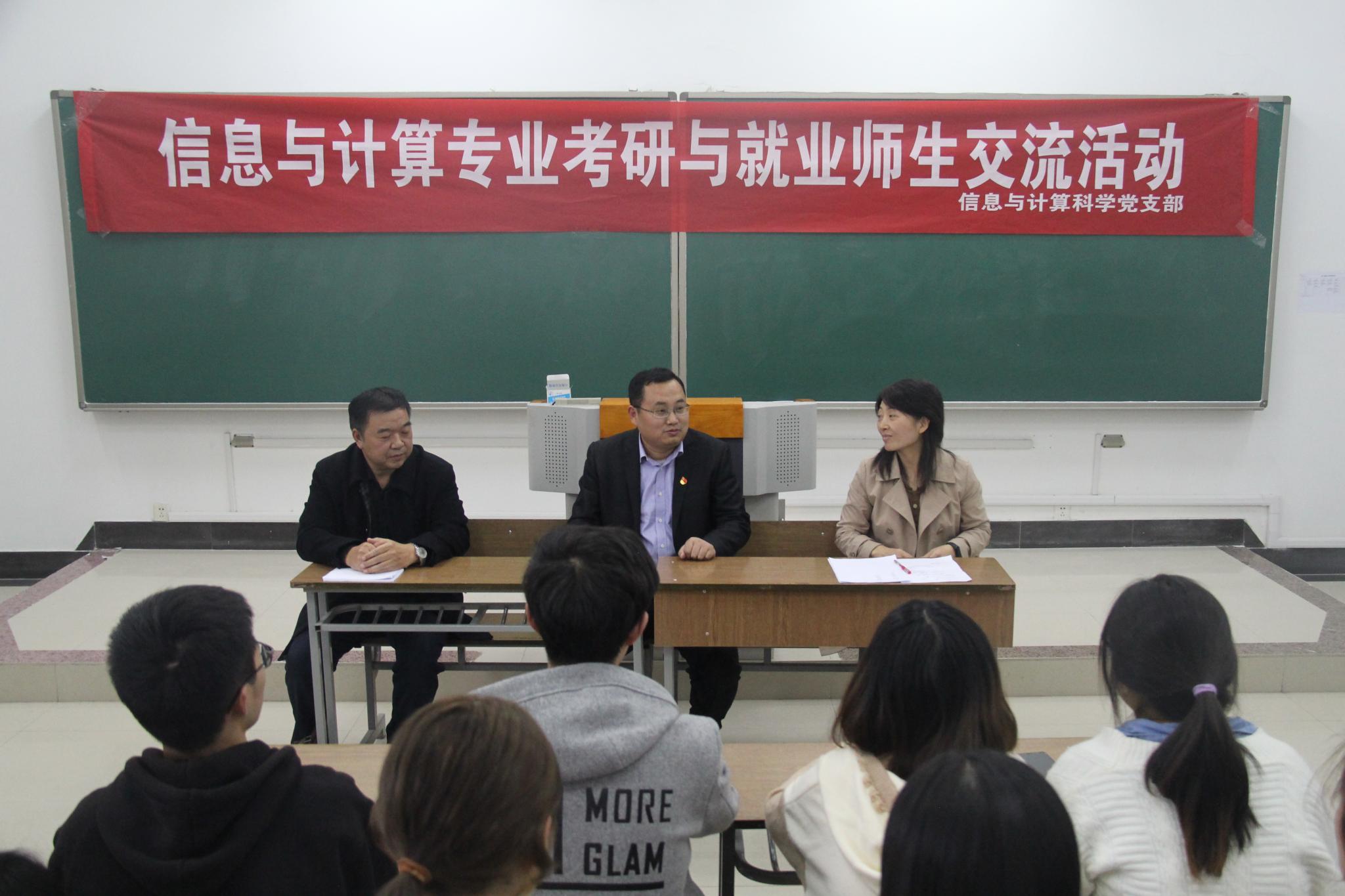 翔宇网10月31日电(记者张雨倩 杨轲旭)为帮助2016级毕业生加强对考研及就业的了解,掌握相关考研技巧,营造积极向上的优良学风。10月30日下午,数统学院在理南107召开信息与计算专业考研与就业师生交流活动。本次活动由信息与计算科学党支部承办,特别邀请了张保祥、周伟、王兆娟、李剑、王兵贤等博士及优秀班主任为同学们解答疑惑。