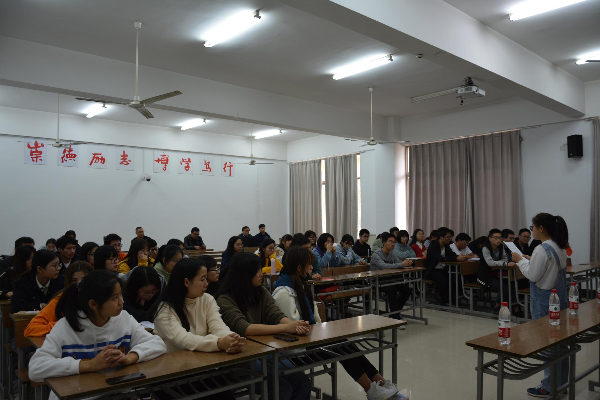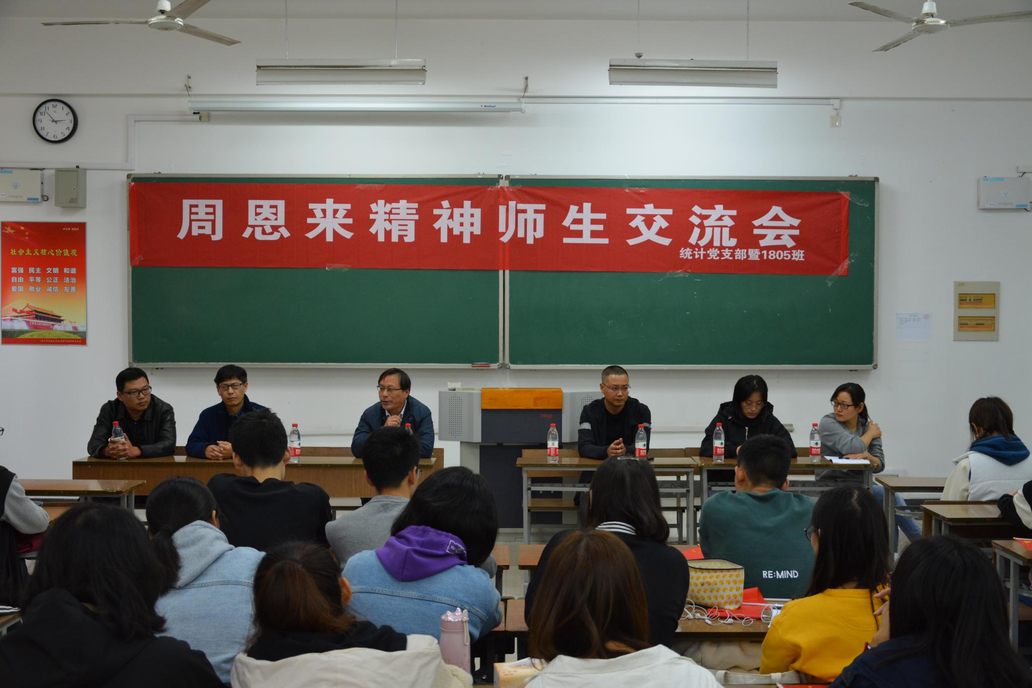 翔宇网11月7日电(记者李琪琪 杨轲旭)为探索感悟周恩来精神,营造积极向上的优良学风。11月6日下午,数统学院在理南103开展周恩来精神师生交流会。本次活动由统计党支部暨1805班承办,1805班班主任王景峰主持,特别邀请了郑发美、朱伏波、邓美玲、嵇伟明等优秀教师及连秀国教授为同学们解答疑惑。