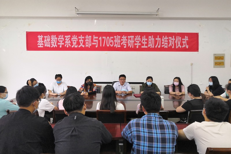 一直以来,数统学院高度重视学风建设,并将考研作为学风建设的重要抓手,着力于学生考研工作的组织体系建设、指导服务体系建设和资源保障体系建设,使学生考研管理工作走向规范化、常态化,并取得了一定的工作成效。基础数学系党支部积极服务学院中心工作,以此助力结对仪式为开端,组织支部成员结对1705班考研学生,做好学生在考研过程中的学习指导、心理帮扶等服务性工作,全方位、全程助力学生考研。