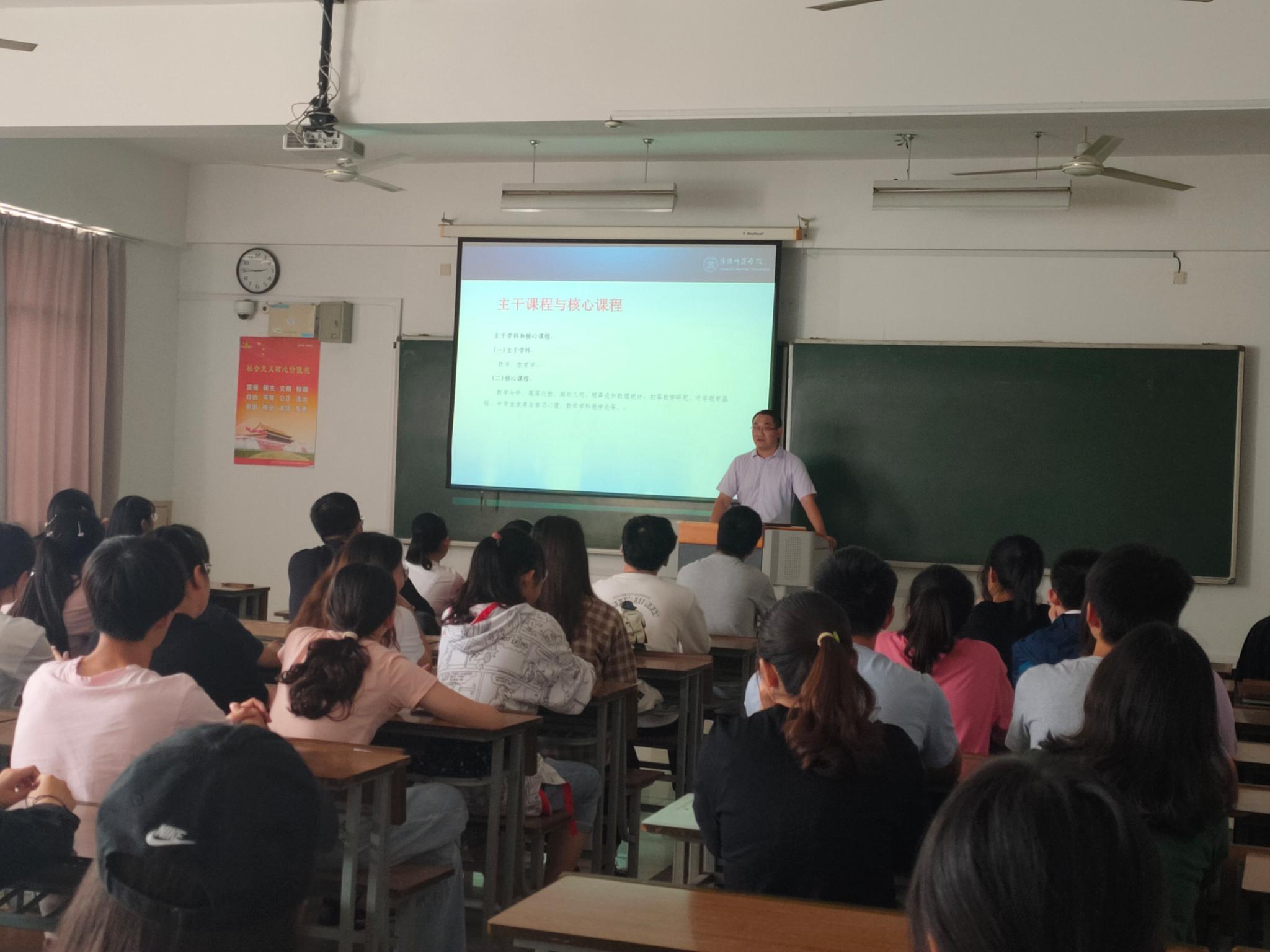 臧庆佩老师根据学校规章制度,要求学生全面了解学校的教学管理规定,提醒同学们保持紧张感,并结合数学专业的课程体系,耐心讲解转专业学生后期的课程安排,明确指出下一步的学习要求。他强调,同学们要清楚自己的选择,认清当前局面,积极适应后期的专业学习生活。同时,臧院长还列举了历年转专业学生学习成绩优秀的典型事迹,坚定了在座学生的学习积极性。此外,就生活方面,臧院长还提出沟通的重要性,遇到困难及时向学院反馈解决。