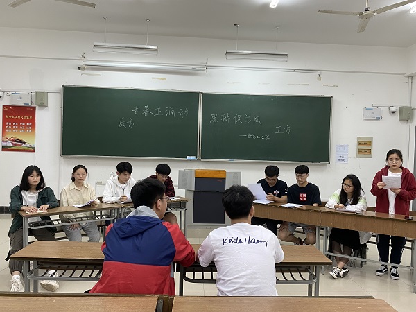翔宇网5月11日电(记者 邵帅 史蘋)应积极响应学院庆祝党百年诞辰的号召,数统2002班在5月10日举办了“青春正涌动,思辨促学风”主题班级辩论赛活动。辩论赛以网络普及对大学生的影响为辩题,激起同学们对自己的反思的监督并进一步促进班级积极向上的学风发展。