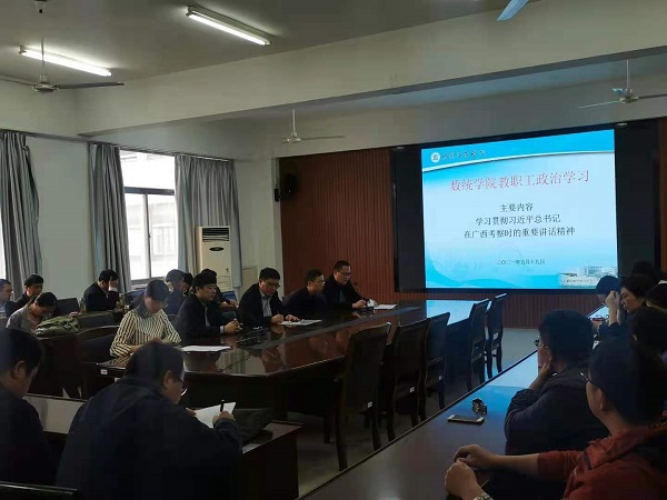 淮师新闻网5月20日电(记者 朱守丽)5月19日,数统学院在理北315室开展专题学习活动,重点学习习近平总书记在广西考察期间重要讲话精神。会议由数统学院党委书记柏传志主持,全体教职工参会。