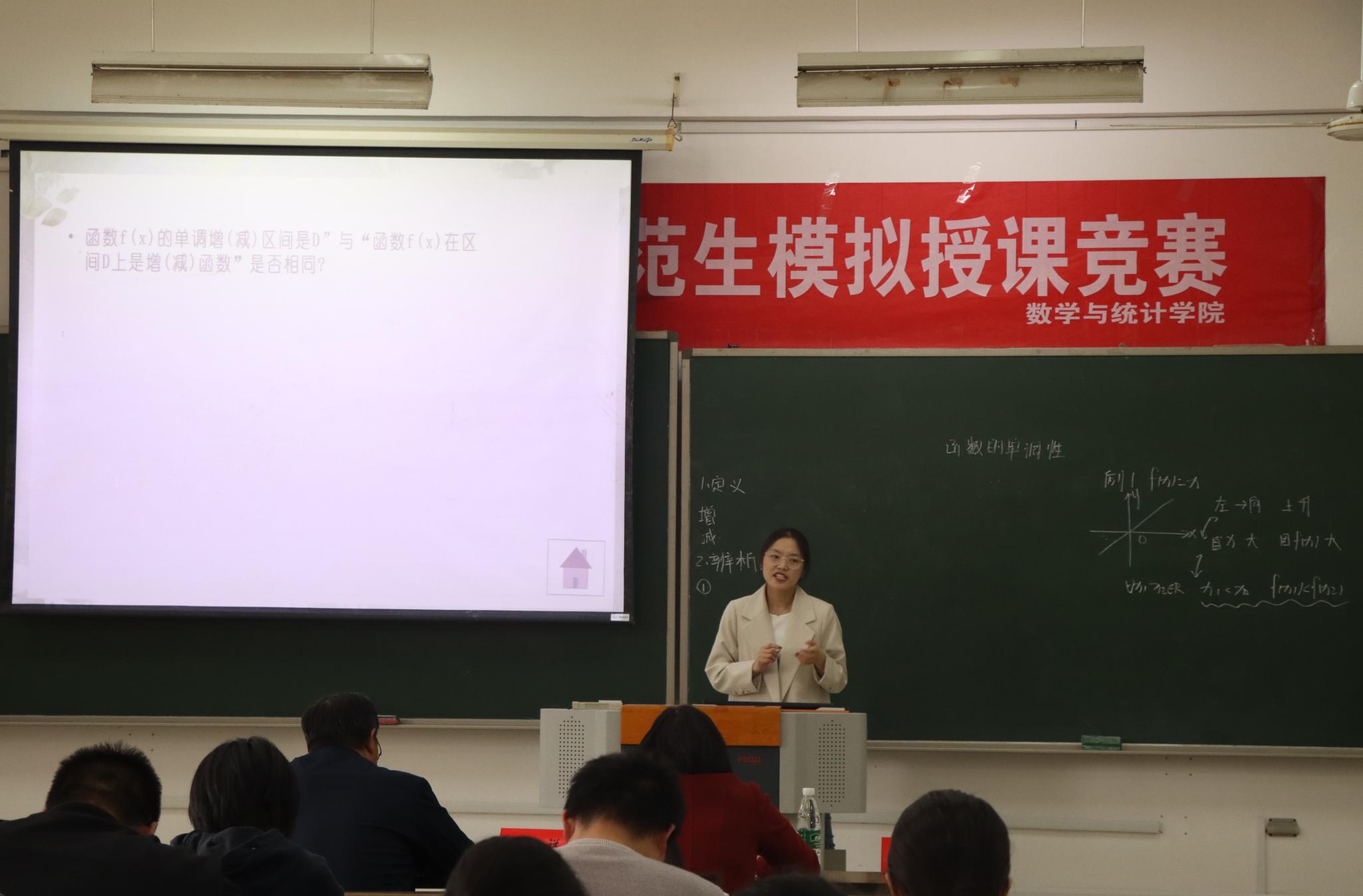 比赛中,选手们准备充分,以“函数的单调性”为授课内容,采用多样的授课方式,从优秀的PPT制作,到课堂上的氛围活跃,再到熟悉的教学内容,通过自然得体的教姿教态、清晰明了的教学思路、准确精炼的语言表达,彰显扎实丰富的教学水平,充分展现了新时代大学师范生的教学风貌和自身风采。随后,各评委老师从教学内容、教学语言、教学设计及课件制作等方面依次对参赛同学进行点评,并结合自身经验提出了宝贵意见,参赛选手和现场听众们都受益匪浅。