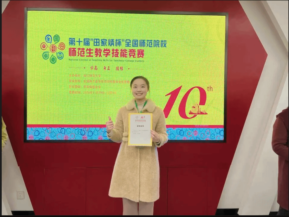 2024年12月1日,作为国内层次最高、规模最大的师范生教学技能竞赛之一的第十届“田家炳杯”全国师范院校师范生教学技能竞赛决赛在浙江师范大学圆满结束,来自全国156所师范院校的优秀学子齐聚一堂,相互切磋技艺。经过激烈角逐,数统2107班王琛琪荣获一等奖,展现了贝博学子良好的精神风貌、扎实的教学基本功和专业的学科素养,实现了贝博在国家级师范院校师范生教学技能竞赛成绩的新突破。