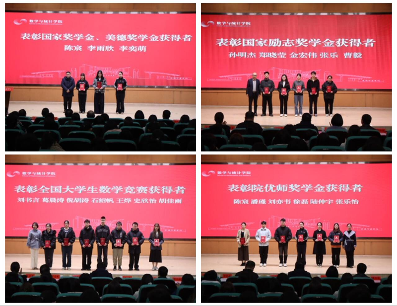 学生代表吉晓蕊、张严元分别从奋斗和安全两方面进行了交流分享,勉励大家将安全作为奋斗之基,让奋斗成为青春底色,逐浪行舟,行稳致远。会上集中表彰了国家奖学金、美德奖学金、国家励志奖学金、全国大学生数学竞赛、全国大学生统计建模大赛、优师奖学金、暑期志愿服务、学霸宿舍等先进集体和个人。